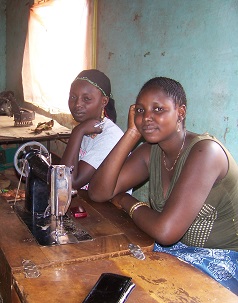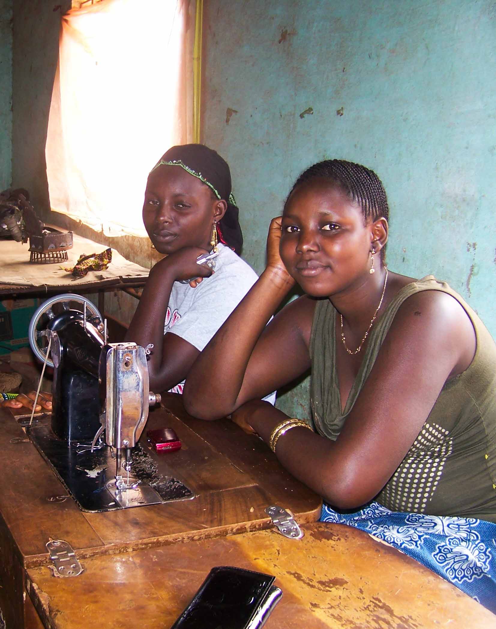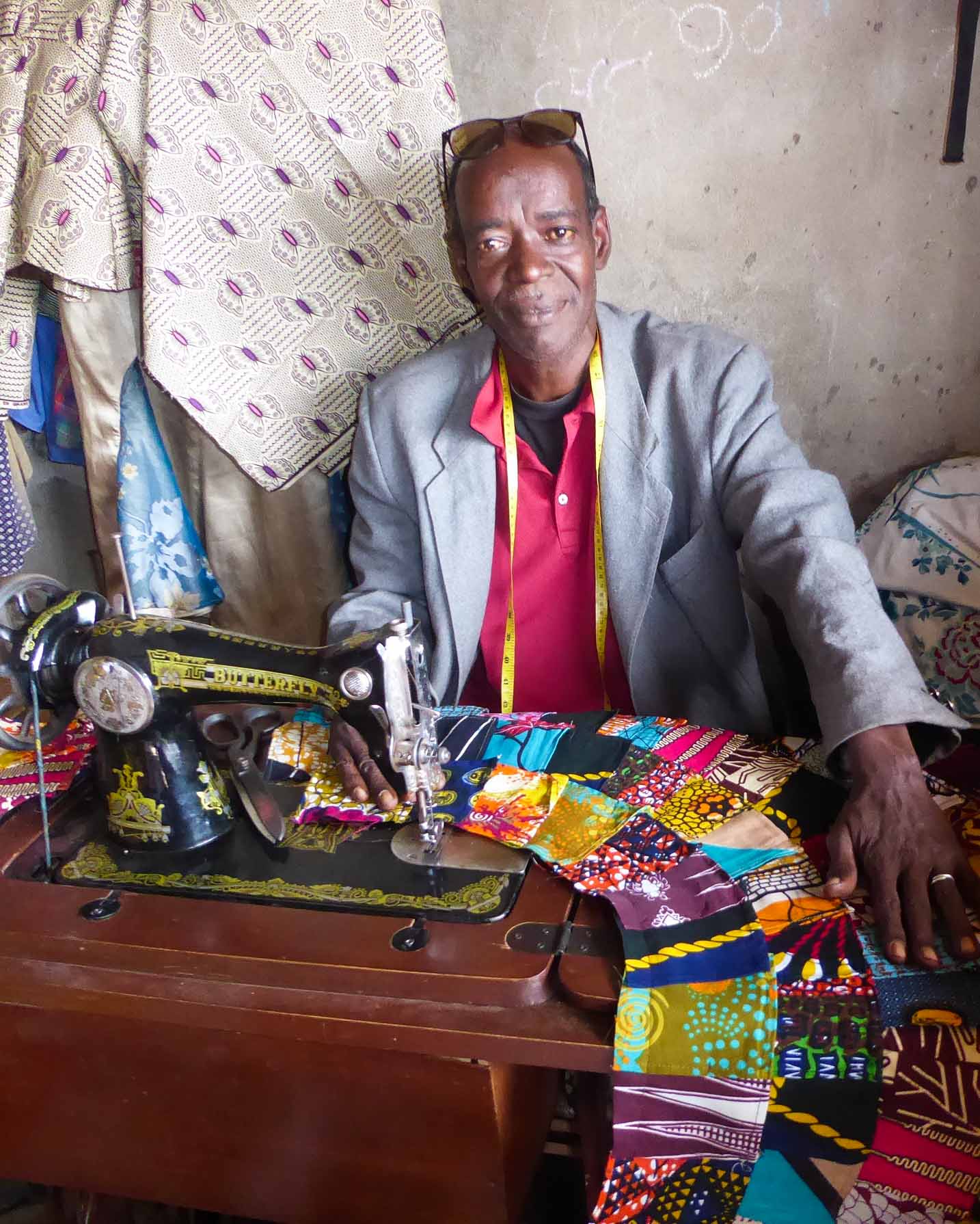 Master tailor Mamadou Alimou Baldé (top left) organizes the production of our Carneval costumes. In his modest workshop, he teaches young adults to sew. Fatou Bah (bottom right) helps Master Baldé to ensure the quality of the products and their transport to the airport in Conakry.